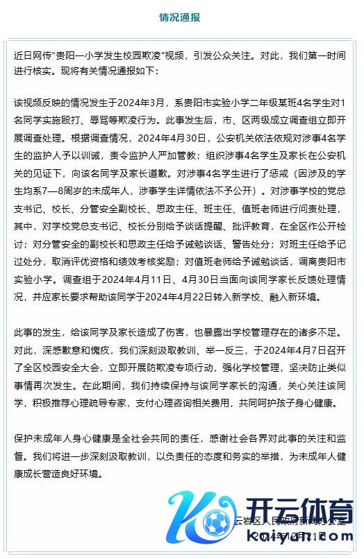 该视频反应的情况发生于2024年3月,系贵阳市实验小学二年岁某班4名学生对1名同学履行殴打、长短等欺侮行径。此事发生后,市、区两级成就走访组立即开展走访处理。把柄走访情况,2024年4月30日,公安机关照章依规对涉事4名学生的监护东谈主赐与经验,责令监护东谈主严加管教;组织涉事4名学生及家长在公安机关的见证下,向该名同学及家长谈歉。对涉事4名学生进行了惩责(因触及的学生均系7—8周岁的未成年东谈主,涉事学生细目照章不予公开)。对涉事学校的党总支布告、校长、摊派安全副校长、想政主任、班主任、值班老诚进行问责处理,其中,对学校党总支布告、校长离别给予话语请示、月旦解说,在全区作公开检验;对摊派安全的副校长和想政主任给予诫勉话语、申饬责罚;对班主任给予记过责罚,取消评优经验和绩效窥探奖励;对值班老诚给予诫勉话语,调离贵阳市实验小学。走访组于2024年4月11日、4月30日迎面向该同学家长反馈处理情况,并应家长条件匡助该同学于2024年4月22日转入新学校、融入新环境。