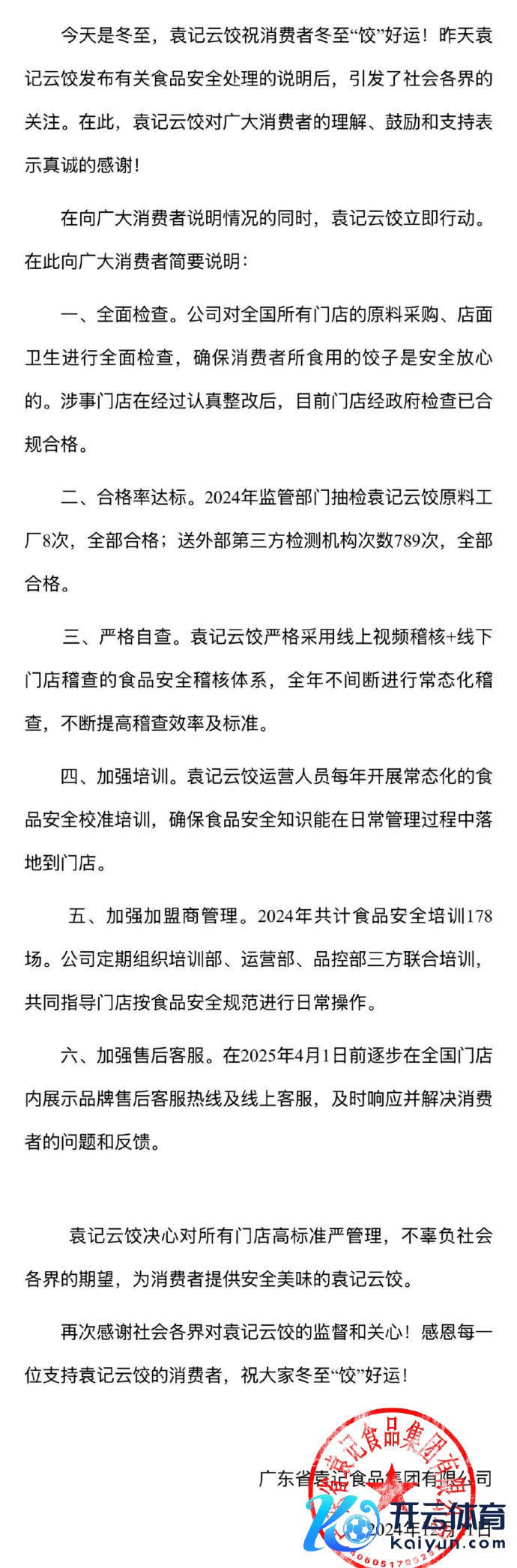 12月20日晚,袁记云饺发布对于北京市海淀区六说念口店出现食物安全问题的情况讲明。袁记云饺称,事发后公司主动揣测奢侈者,对于投诉认识“赐与了积极的抵偿回报”,对于涉事加盟门店已责令歇业整顿一周(12月2日-12月8日),对涉事门店的店长已作念出开除处理体育游戏app平台,并对其他联系株连东说念主进行了严肃责罚。