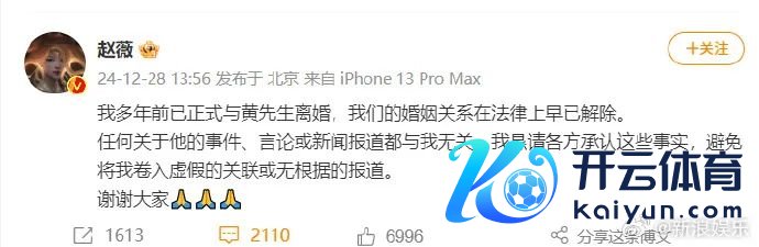 蓝鲸新闻12月28日讯 12月28日,演员@赵薇发文称,“我多年前已隆重与黄先生离异,咱们的婚配关系在法律上早已销毁。何干于他的事件、言论或新闻报说念王人与我无关。我恳请各方承认这些事实,幸免将我卷入乖张的关系或无字据的报说念。”
