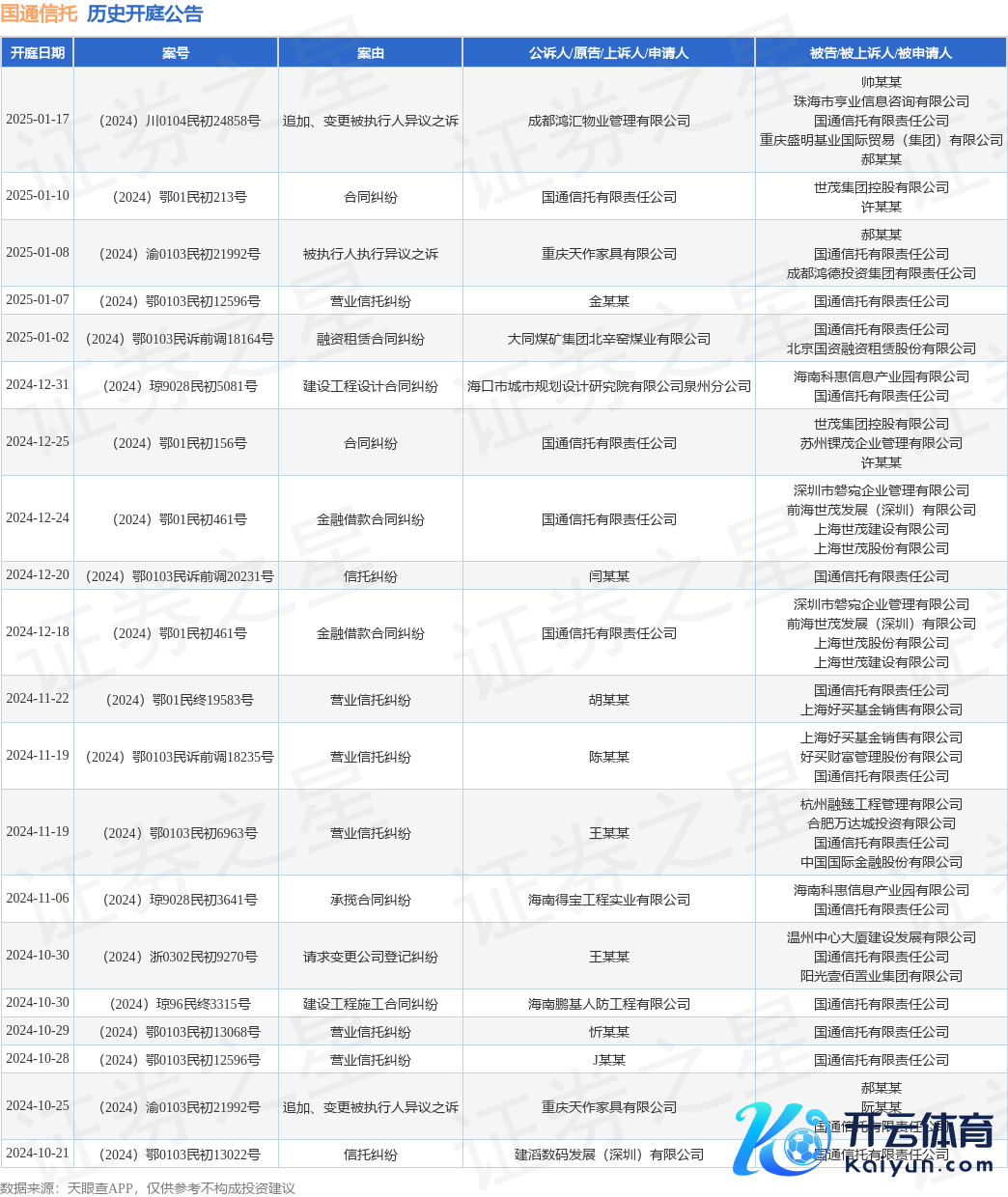 案号:(2024)鄂0103民初12596号审理法院:武汉市江汉区东说念主民法院案由:生意相信纠纷当事东说念主信息: 原告/上诉东说念主:金某某 被告/被上诉东说念主:国通讯托有限包袱公司开庭日历:2025年1月7日把柄统计,近一年内以国通讯托有限包袱公司为当事东说念主的历史开庭公告有56则,其中案由为“生意相信纠纷”的公告以11则居首,其次为“左券纠纷”有9则,“案外东说念主奉行异议之诉”有8则。历史开庭公告(前20条)如下: