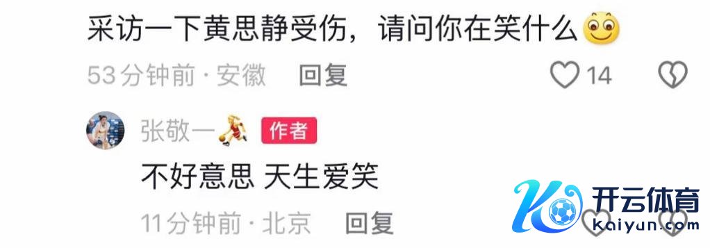 有网友在社媒“声讨”北京女篮队员张敬一:“采访一下黄想静受伤,教唆你在笑什么。”。张敬一则复兴:“不好预料,天生爱笑。”