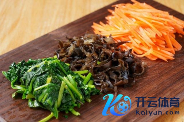 将胡萝卜和木耳切成丝,菠菜切成段备用。