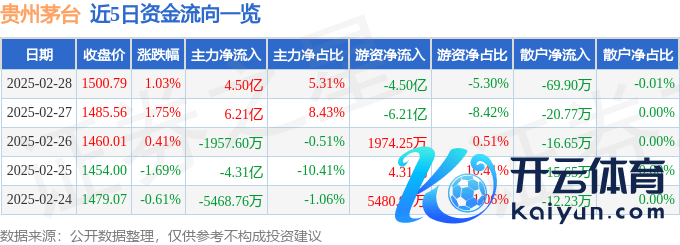 本站音尘,适度2025年2月28日收盘,贵州茅台(600519)报收于1500.79元,飞腾1.03%,换手率0.45%,成交量5.61万手,成交额84.76亿元。