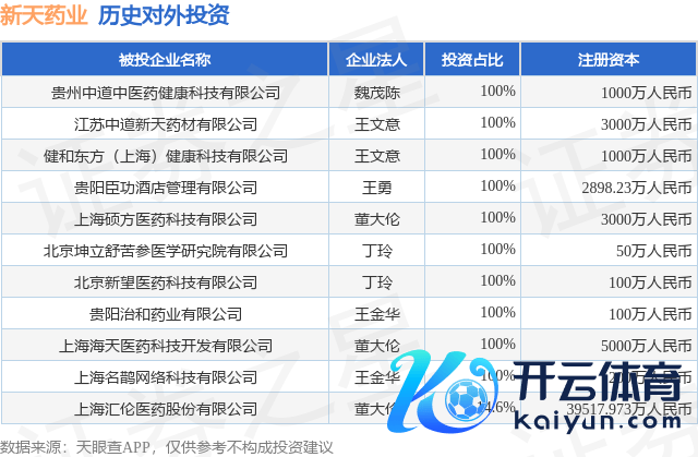 本站音问,凭证天眼查APP显现,新天药业(002873.SZ)新增扫数对外投资事件,被投资公司为贵州中谈中医药健康科技有限公司,法定代表东谈主魏茂陈,投资占比为100%。该公司从事食物制造业开云体育,注册老本为1000万东谈主民币。当今,新天药业共存在对外投资11项,详见下表: